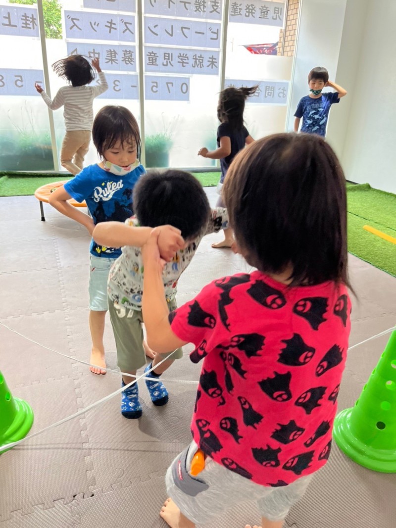 フープとコーンを使って輪投げを行ったり、トランポリンを跳びながらフラッシュカードに挑戦したりと、様々なバリエーションで楽しむことができます♪子どもたちからも「こうやってやってみたい!」など、積極的に取り組み、楽しんでいる様子が伺えます!