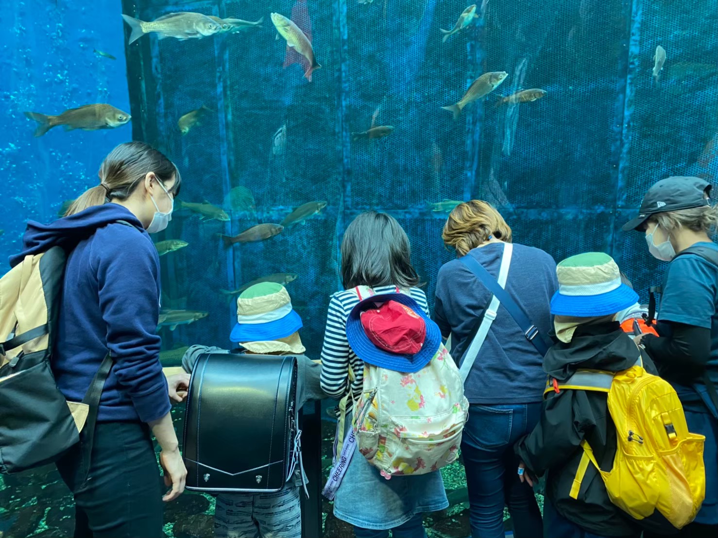 琵琶湖博物館にはいると少し暗い通路に。ワクワクしながら進み、明るくなったと思うと、魚たちが視界いっぱいに広がります!水槽の中に通路が走っており、壁や天井に魚が泳いでいました。みんな「すごーい!」「おさかな!」と声を上げて、大盛り上がりです。